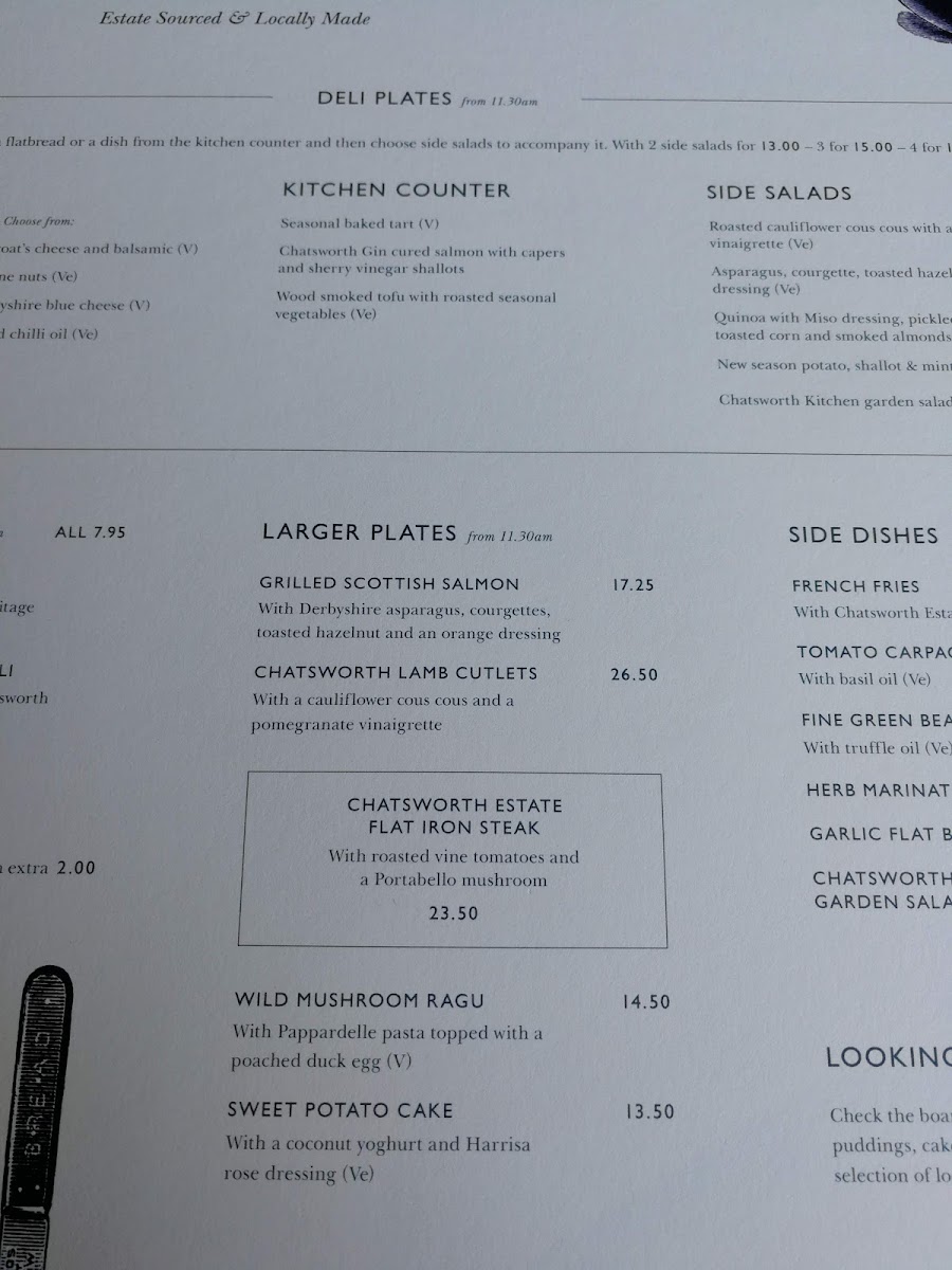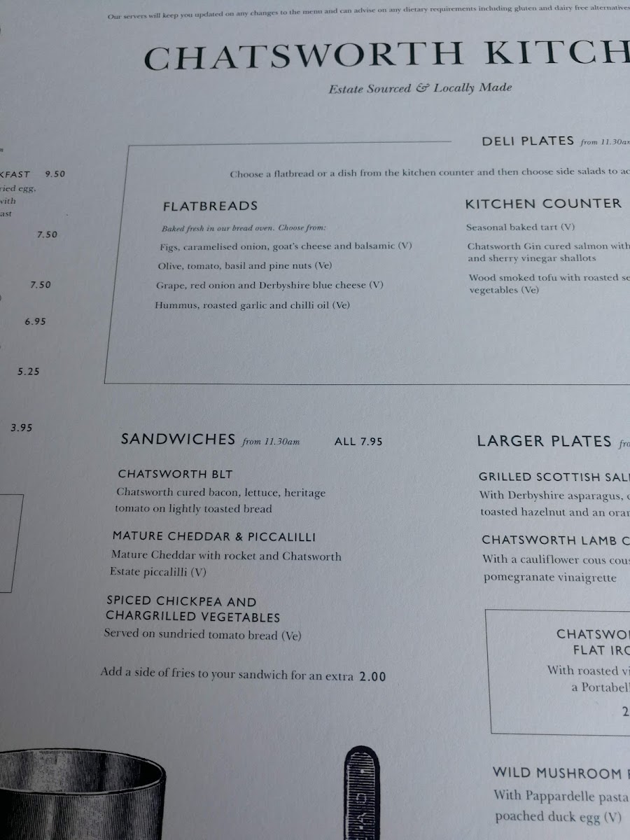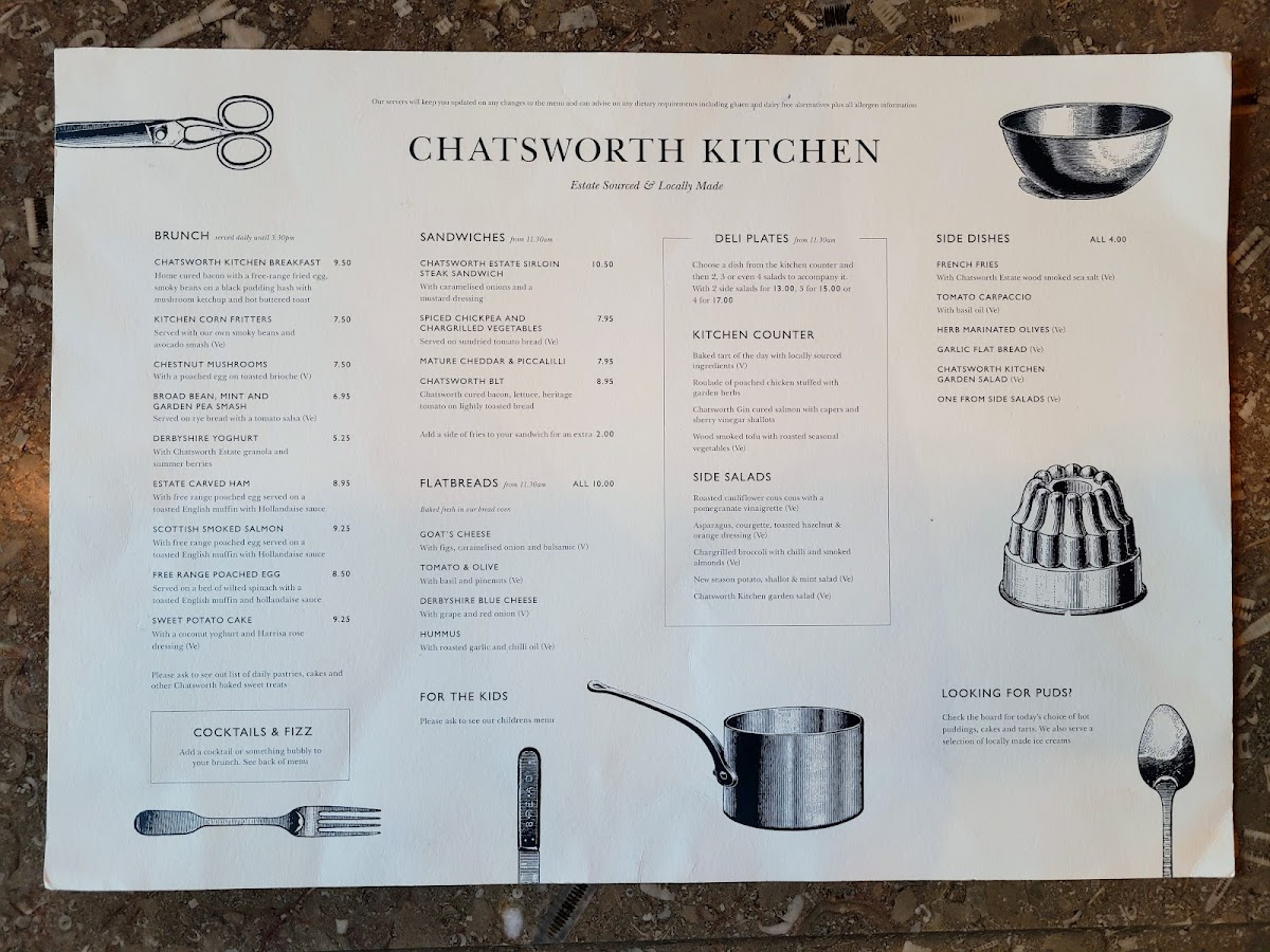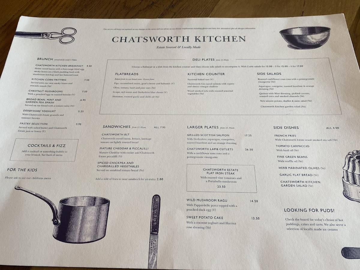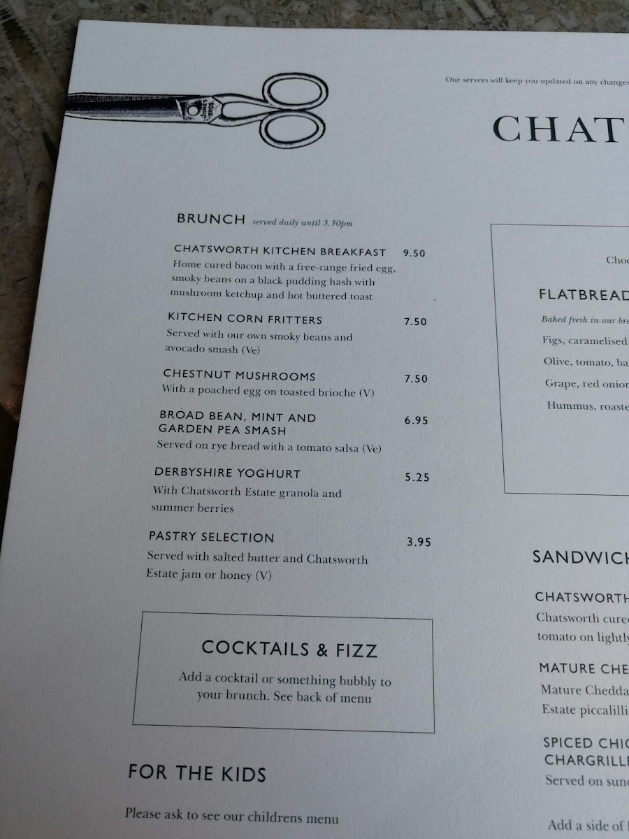 The menu at Chatsworth Kitchen in Peak Shopping Village offers a delightful selection of dishes catering to a variety of tastes. For brunch, you can enjoy the hearty Chatsworth Kitchen Breakfast or the lighter Kitchen Corn Fritters. There’s also the fresh Chestnut Mushrooms Broad Bean, Mint And Garden Pea Smash and a refreshing side of Derbyshire Yoghurt. Sandwich options include the indulgent Chatsworth Estate Sirloin Steak Sandwich and the vegetarian-friendly Spiced Chickpea and Chargrilled Vegetables with mature cheddar and piccalilli. For those seeking lighter bites, the Chatsworth BLT is a great choice. Side salads like the Roasted Cauliflower Cous Cous with a Pomegranate Vinaigrette and Chargrilled Broccoli with Chilli and Smoked Almonds offer fresh and zesty complements. Larger plates feature mouthwatering choices such as Grilled Scottish Salmon, Chatsworth Lamb Cutlets, and the rich Wild Mushroom Ragu with Sweet Potato Cake. Specialty coffees, including Americano and Cappuccino, along with an array of soft drinks like Cloudy Apple Juice and Gusto Organic, are perfect for pairing with your meal. For a more indulgent option, cocktails such as the Chatsworth Bloody Mary and Aperol Spritz are on offer, alongside local beers like Peak Ales Chatsworth Gold. The wine list features selections like Earl of Burlington Côtes De Gascogne for white wine and Malbec, Ruca Malen, Mendoza for red. You can also enjoy some bubbly with a glass of Prosecco Le Colture or the Devonshire Grand Cru Brut. For a sweet finish, treat yourself to the Baked Tart of the Day with Locally Sourced Ingredients or indulge in the creamy richness of Goat's Cheese, Tomato & Olive. Overall, Chatsworth Kitchen offers a well-rounded, locally inspired menu that’s perfect for any occasion.