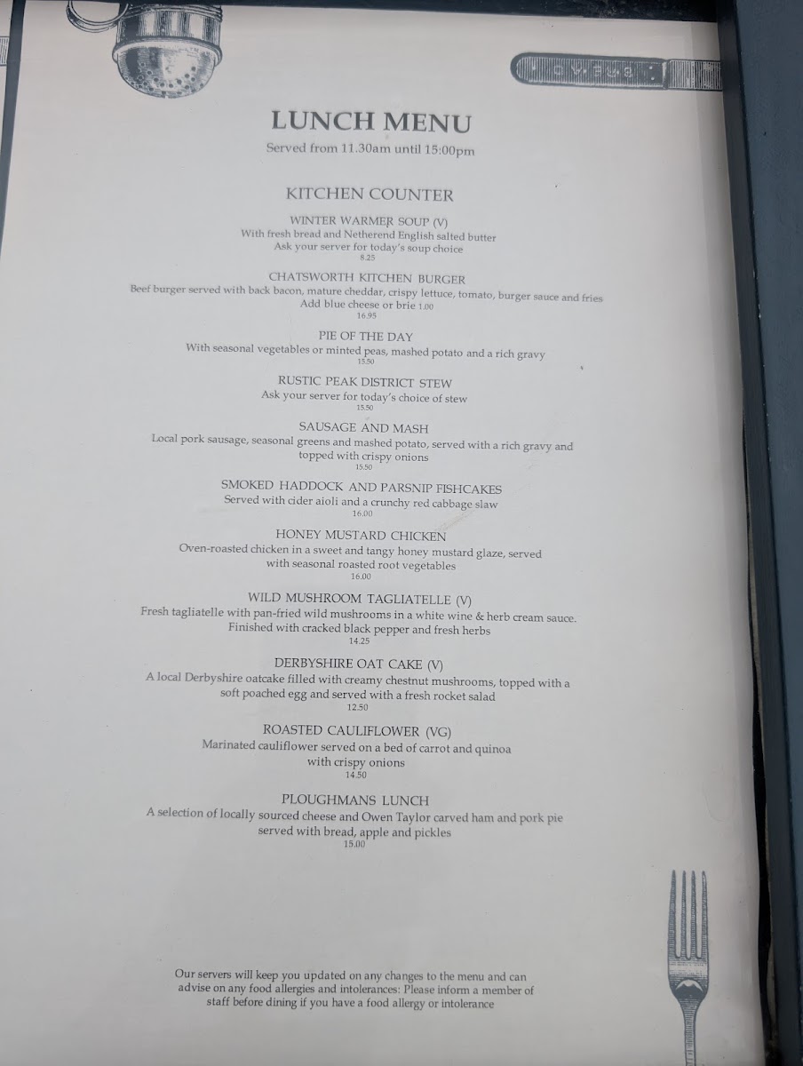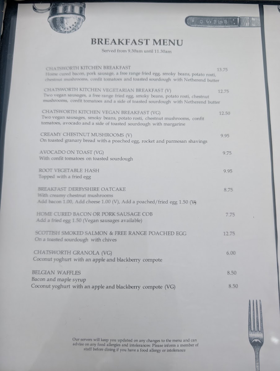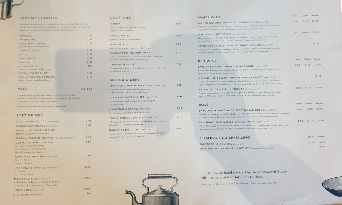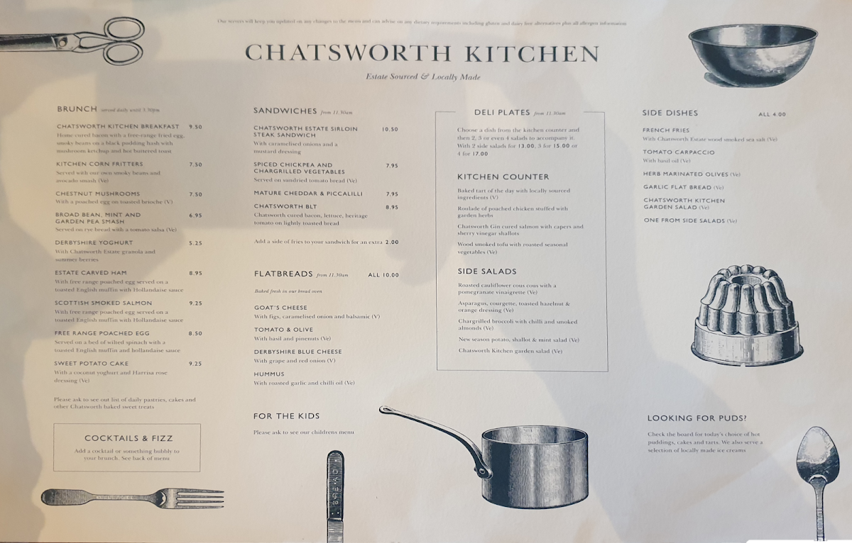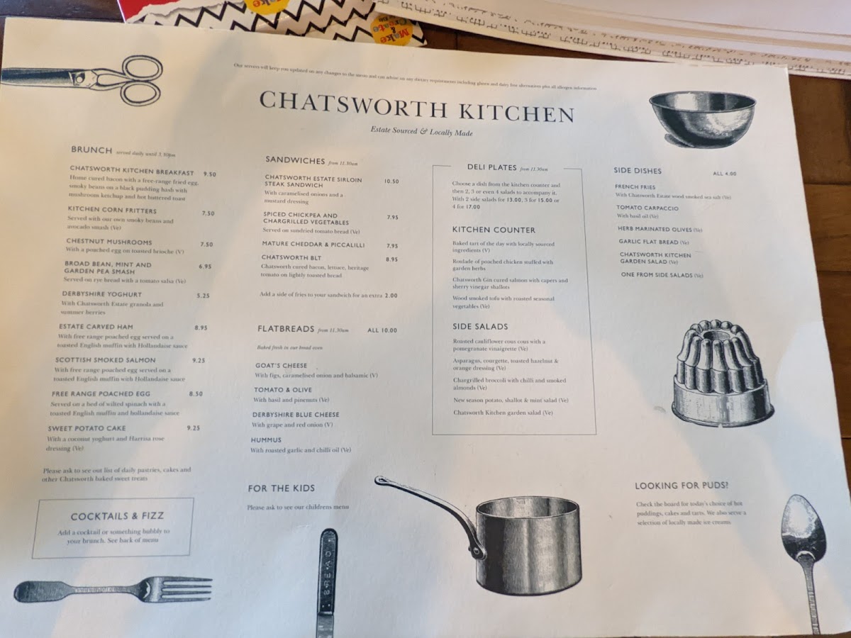 The menu at Chatsworth Kitchen in Peak Shopping Village offers a delightful selection of dishes catering to a variety of tastes. For brunch, you can enjoy the hearty Chatsworth Kitchen Breakfast or the lighter Kitchen Corn Fritters. There’s also the fresh Chestnut Mushrooms Broad Bean, Mint And Garden Pea Smash and a refreshing side of Derbyshire Yoghurt. Sandwich options include the indulgent Chatsworth Estate Sirloin Steak Sandwich and the vegetarian-friendly Spiced Chickpea and Chargrilled Vegetables with mature cheddar and piccalilli. For those seeking lighter bites, the Chatsworth BLT is a great choice. Side salads like the Roasted Cauliflower Cous Cous with a Pomegranate Vinaigrette and Chargrilled Broccoli with Chilli and Smoked Almonds offer fresh and zesty complements. Larger plates feature mouthwatering choices such as Grilled Scottish Salmon, Chatsworth Lamb Cutlets, and the rich Wild Mushroom Ragu with Sweet Potato Cake. Specialty coffees, including Americano and Cappuccino, along with an array of soft drinks like Cloudy Apple Juice and Gusto Organic, are perfect for pairing with your meal. For a more indulgent option, cocktails such as the Chatsworth Bloody Mary and Aperol Spritz are on offer, alongside local beers like Peak Ales Chatsworth Gold. The wine list features selections like Earl of Burlington Côtes De Gascogne for white wine and Malbec, Ruca Malen, Mendoza for red. You can also enjoy some bubbly with a glass of Prosecco Le Colture or the Devonshire Grand Cru Brut. For a sweet finish, treat yourself to the Baked Tart of the Day with Locally Sourced Ingredients or indulge in the creamy richness of Goat's Cheese, Tomato & Olive. Overall, Chatsworth Kitchen offers a well-rounded, locally inspired menu that’s perfect for any occasion.